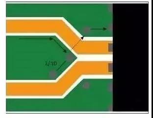 時(shí)鐘分布或合成器設(shè)備路由出來、用于承載相同頻率的跡線集群可能相鄰而行,因?yàn)楦蓴_源音調(diào)已經(jīng)存在于接收器線路上。不過,分組的線路最終會(huì)分散。分散時(shí),應(yīng)在分散線路之間提供接地灌流,并在其開始分散的地方灌入通孔,以便感應(yīng)回流沿著額定回流路徑流回。在圖3中,接地島末端的通孔可使感應(yīng)電流流到參考層上。接地灌流上其它通孔之間的間隔不要超過一個(gè)波長的十分之一,以確保接地不會(huì)成為共振結(jié)構(gòu)。