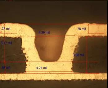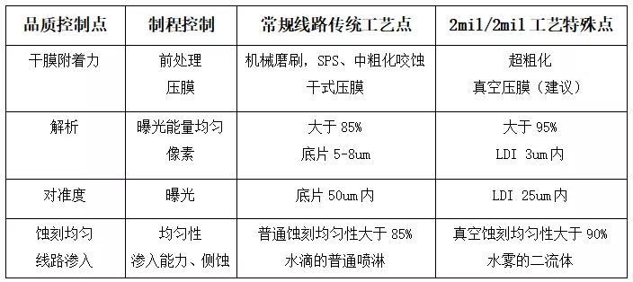 由于2mil/2mil線路細(xì)密,在影像轉(zhuǎn)移過(guò)程需要有精良的對(duì)位精度和優(yōu)良的解析能力,干膜附著力,蝕刻需有均勻蝕刻等要求。行業(yè)內(nèi)均推薦LDI爆光,使用1mil的干膜,有些板廠客戶已引進(jìn)真空蝕刻機(jī)加二流體進(jìn)行蝕刻。